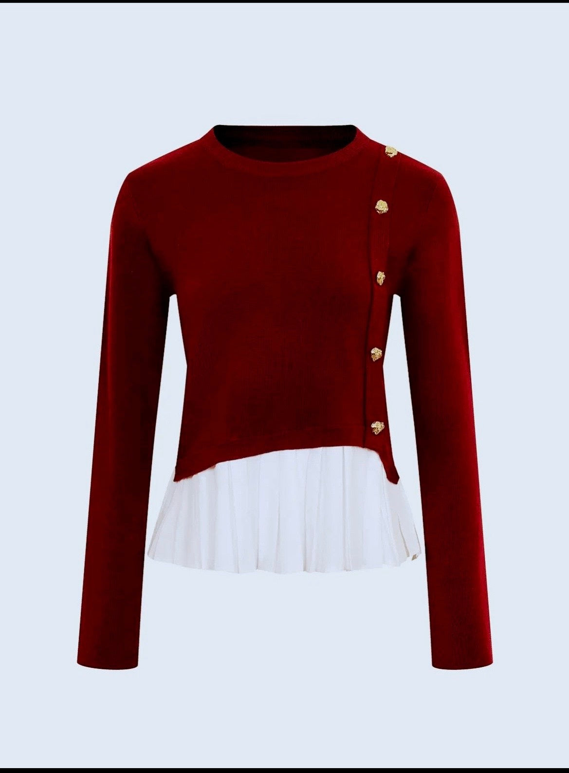 This sweater is the best of both worlds with a combination of sweater and shirt. Quality knit sweater with pleated bottom. Gold buttons add a additional pop of color with class. Great for the office or a night out on the time. Runs true to size.